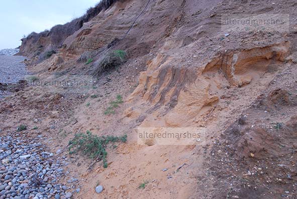 Regarding Hydraulic Action, waves propel air in advance of them and squeeze it against the cliff face. When the air is freed, it inflates with considerable force, destabilising and tearing away part of the cliff. In a connected process, Desiccated Cracking, the combined attrition of the weather and action of waves, can weaken a cliff face. Alternate heating and cooling cause the body of the cliff to expand and contract, creating cracks in which rain and sea water seep into crevices. When water freezes it expands massively, loosening segments of cliff face, additionally, when a cliff surface, dries and hardens, cracks can widen and deepen. Hydraulic actions, dampening and drying can cause large slippages of whole sections of sand and clay in a process known as sheer stress.