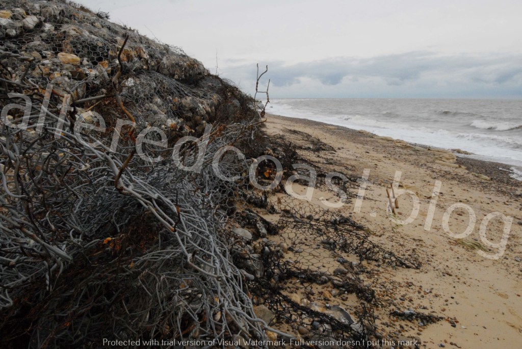 As a physical contribution to attempts to understand the erosion, a photo taken in late December 2024, could hint at early processes at work immediately south of the rock revetment on Thorpeness beach. It appears wave action was reaching beyond the Gabion stone baskets and starting to erode into the face of the sandy cliffs.