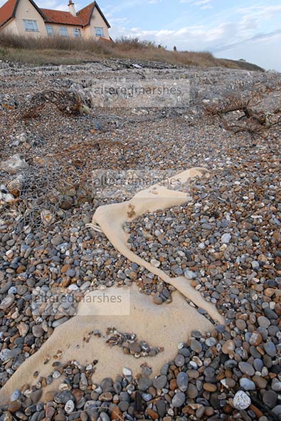 The next location, Sudbourne Beach provides a different setting in which to consider the Palimpsest. It is a high-energy shifting shingle beach, and in such a dynamic area, it is hard to identify threads of current and past coastal change. Recently, the ridge at the back of the beach has flattened with an extensive wide area of shingle showing signs of overtopping with shingle washed by waves into two tongues down to the marshes. The shingle fan stops short of the waterway behind the earthen flood defence that protects the River Alde.