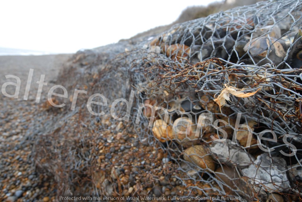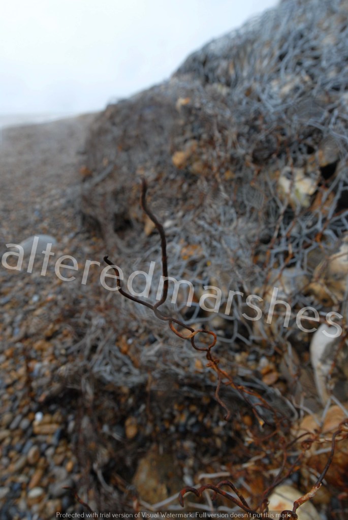 Feather caught on rusted wire. Stone Gabion Basket flood defences, damaged by the sea. Thorpeness Beach 31st December 2022