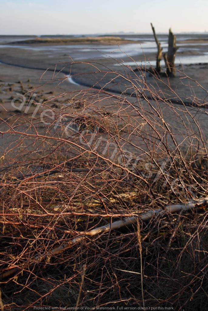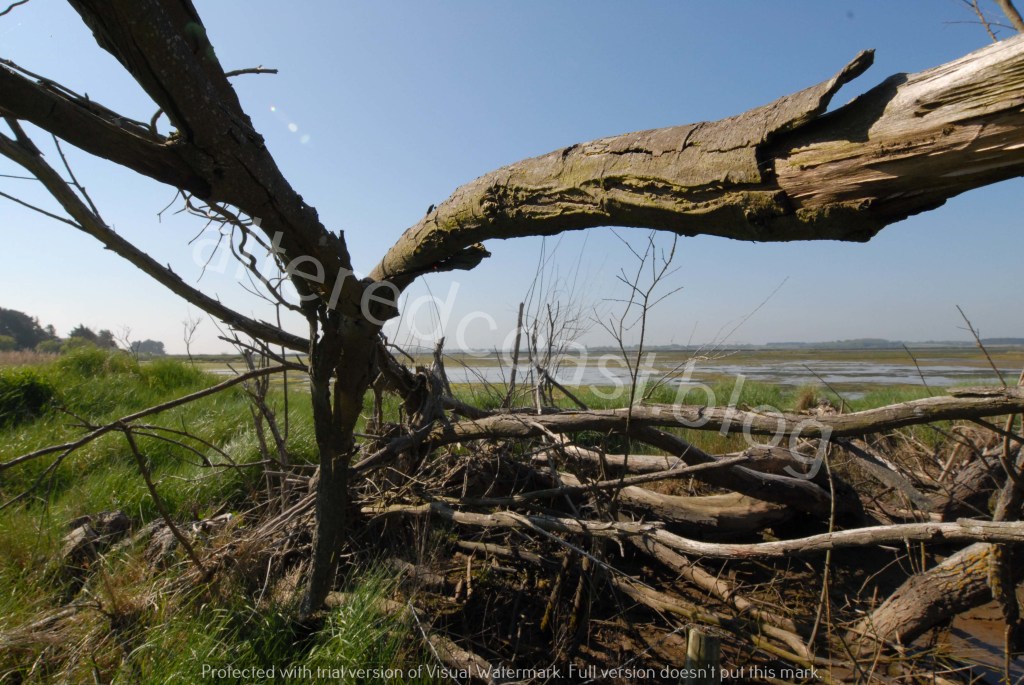 Salt-Scoured tree branches, remnants from storm surge that breached sea defences in 2013. Hazelwood Marshes. 13th May 2021
