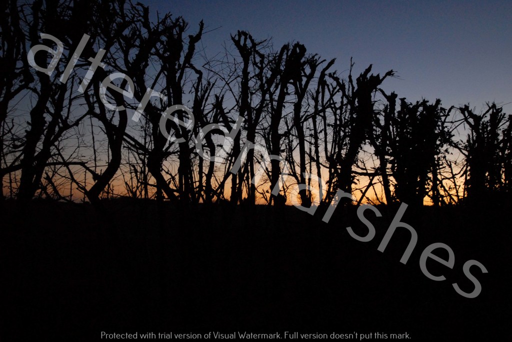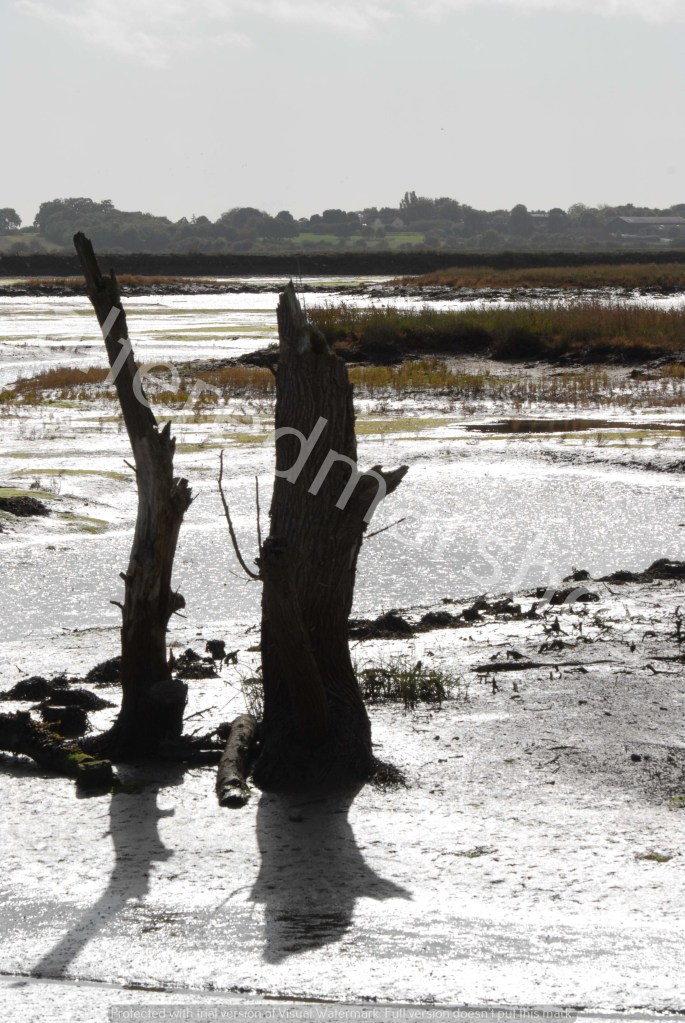 Silvery sun over salt-scoured remains of a tree. Hazelwood Marshes 2nd October 2022