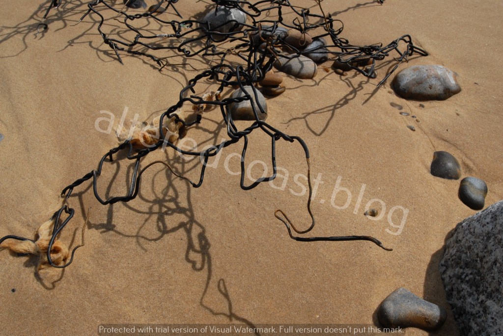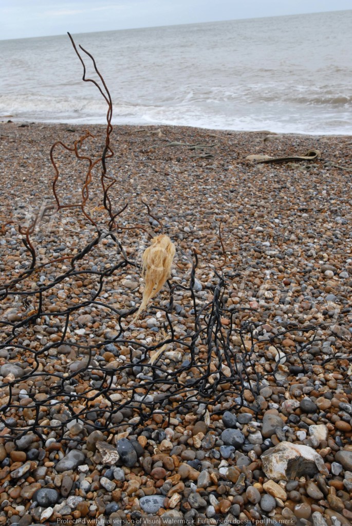 Broken rusted wire from Gabion Basket flood defence. Thorpeness Beach. 3rd July 2023