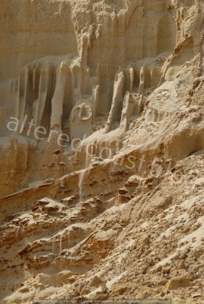 Sand drifting off the front of eroded cliffs. Thorpeness Beach. 11th August 2023.