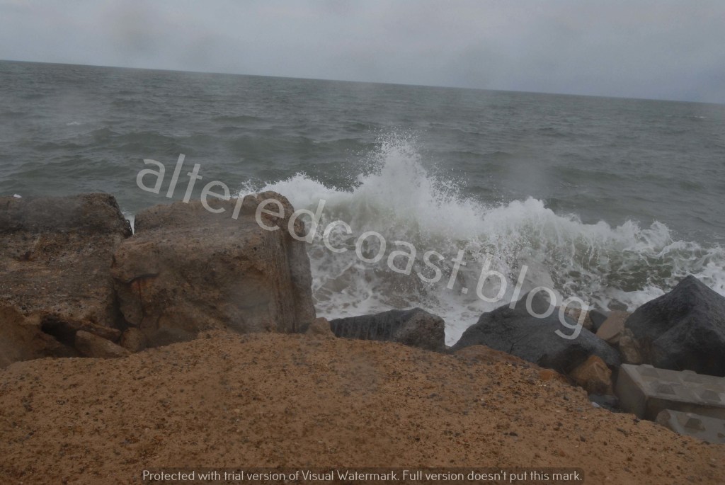 Spray from waves recoiling from hitting sea defence blocks clashes with incoming waves. Hemsby Gap. 17th September 2023